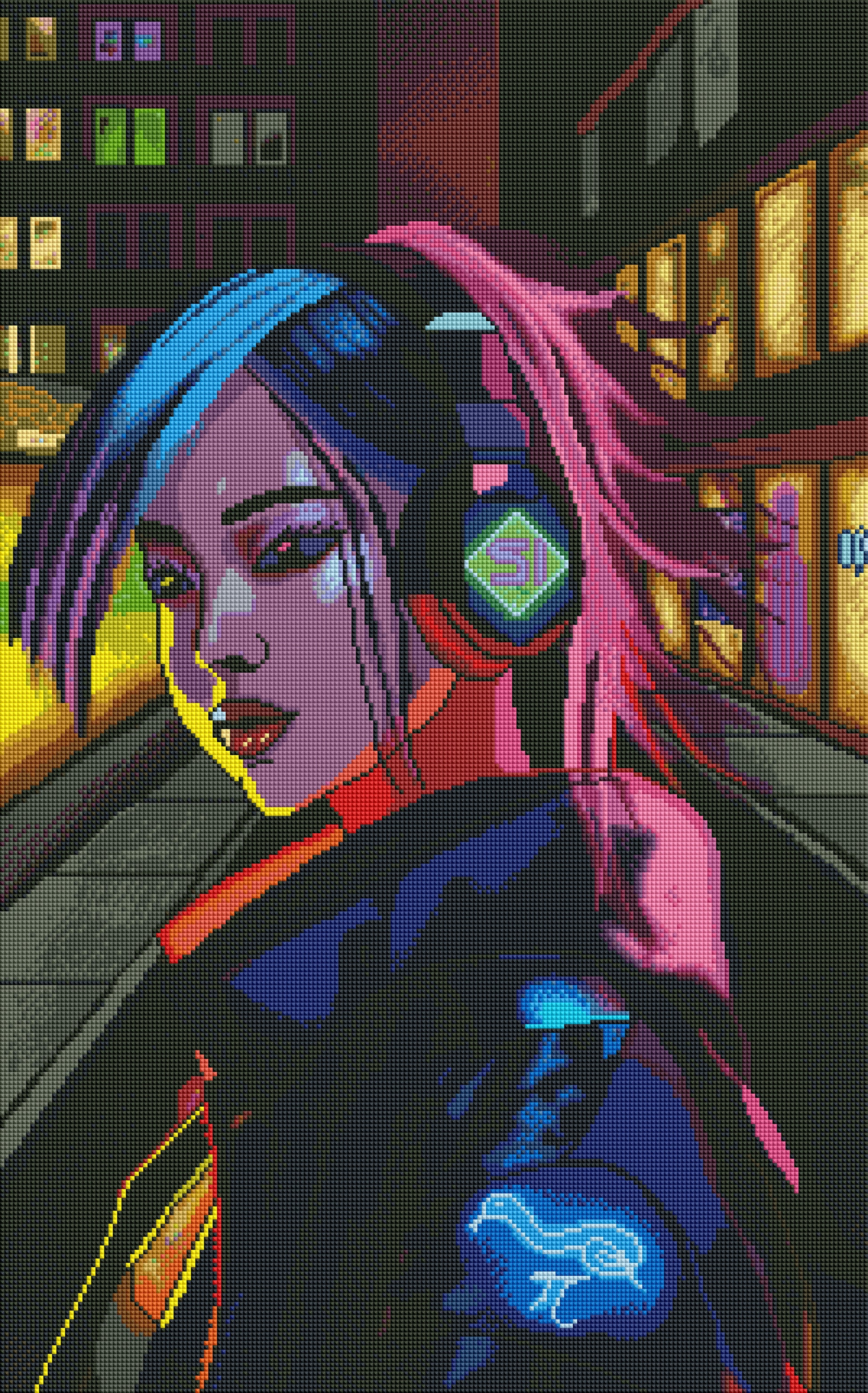 A confident, neon-lit character with multicolored hair and glowing headphones strides through a cyberpunk cityscape guided by the rhythm of the music.