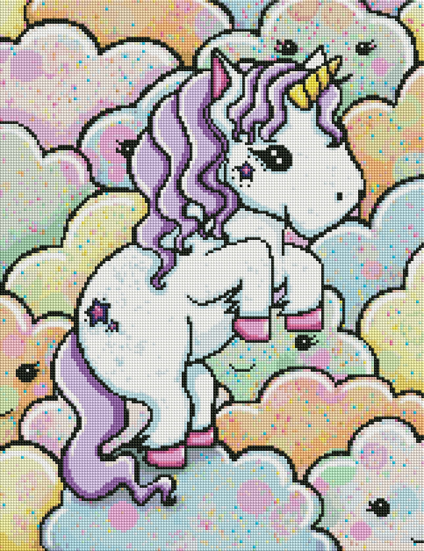 Dive into pure pastel magic with this irresistibly cute chibi unicorn! A fluffy white unicorn with a soft lavender mane and sparkling golden horn adorned with pink star markings. Surrounded by dreamy rainbow clouds and sprinkled with tiny confetti-like sparkles, this whimsical piece radiates joy and sweetness in every pixel.