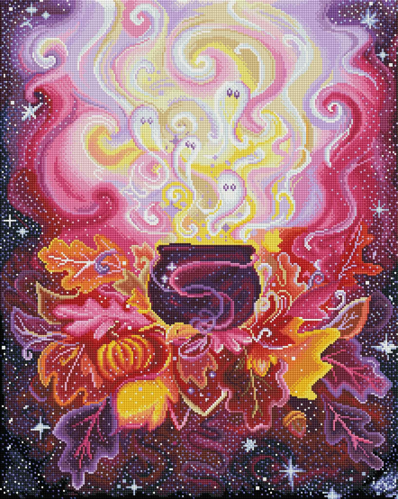 This enchanting diamond art kit features a mystical purple cauldron releasing swirling vapors with playful ghosts, surrounded by vibrant autumn leaves and pumpkins. The colorful, starry background offers a magical and festive piece for your next crafting project.