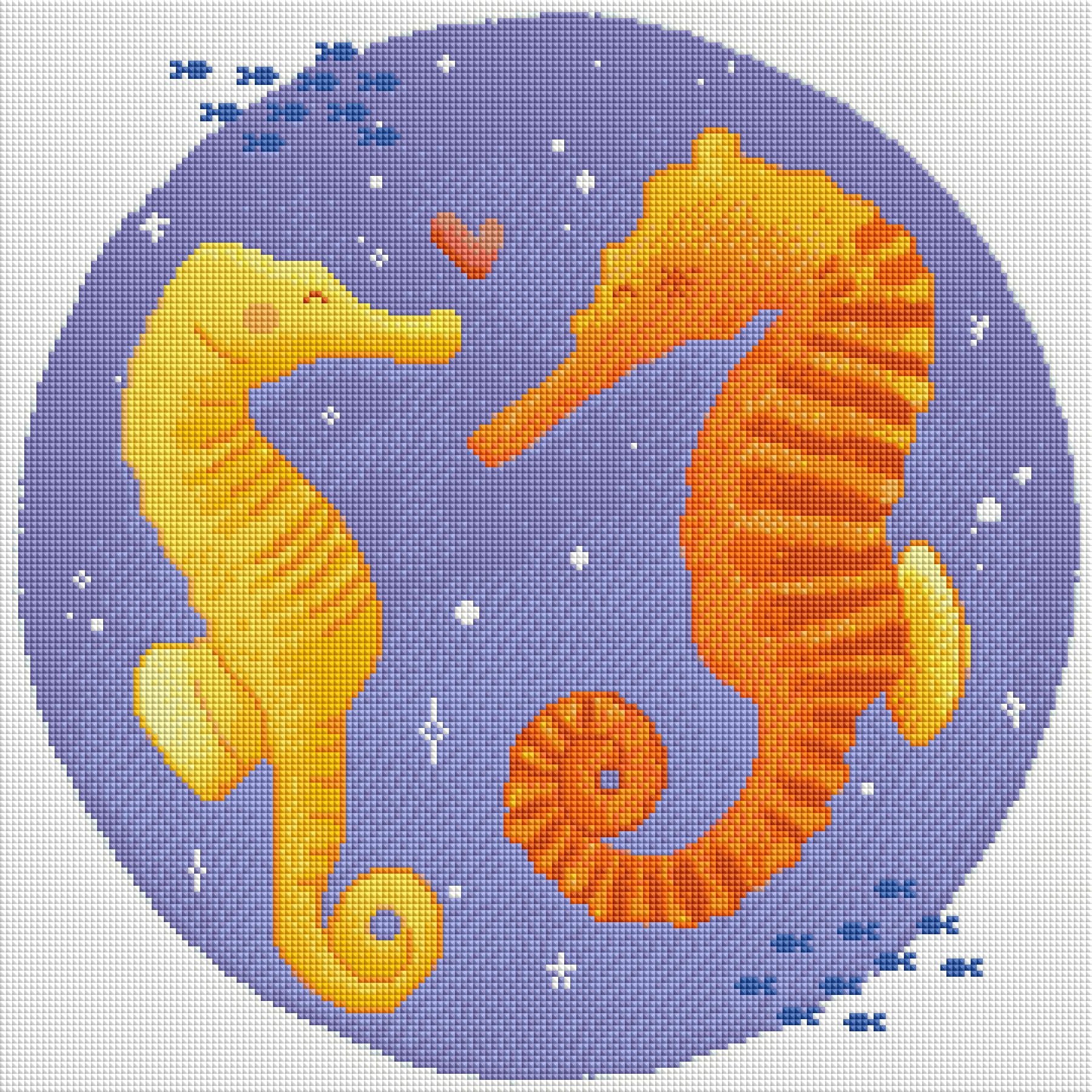 This charming diamond art design showcases two sweet seahorses—one golden yellow and one warm orange—gently facing each other beneath a dreamy purple sea. Surrounded by tiny bubbles and a floating heart, this whimsical underwater scene sparkles with warmth and ocean-inspired magic.
