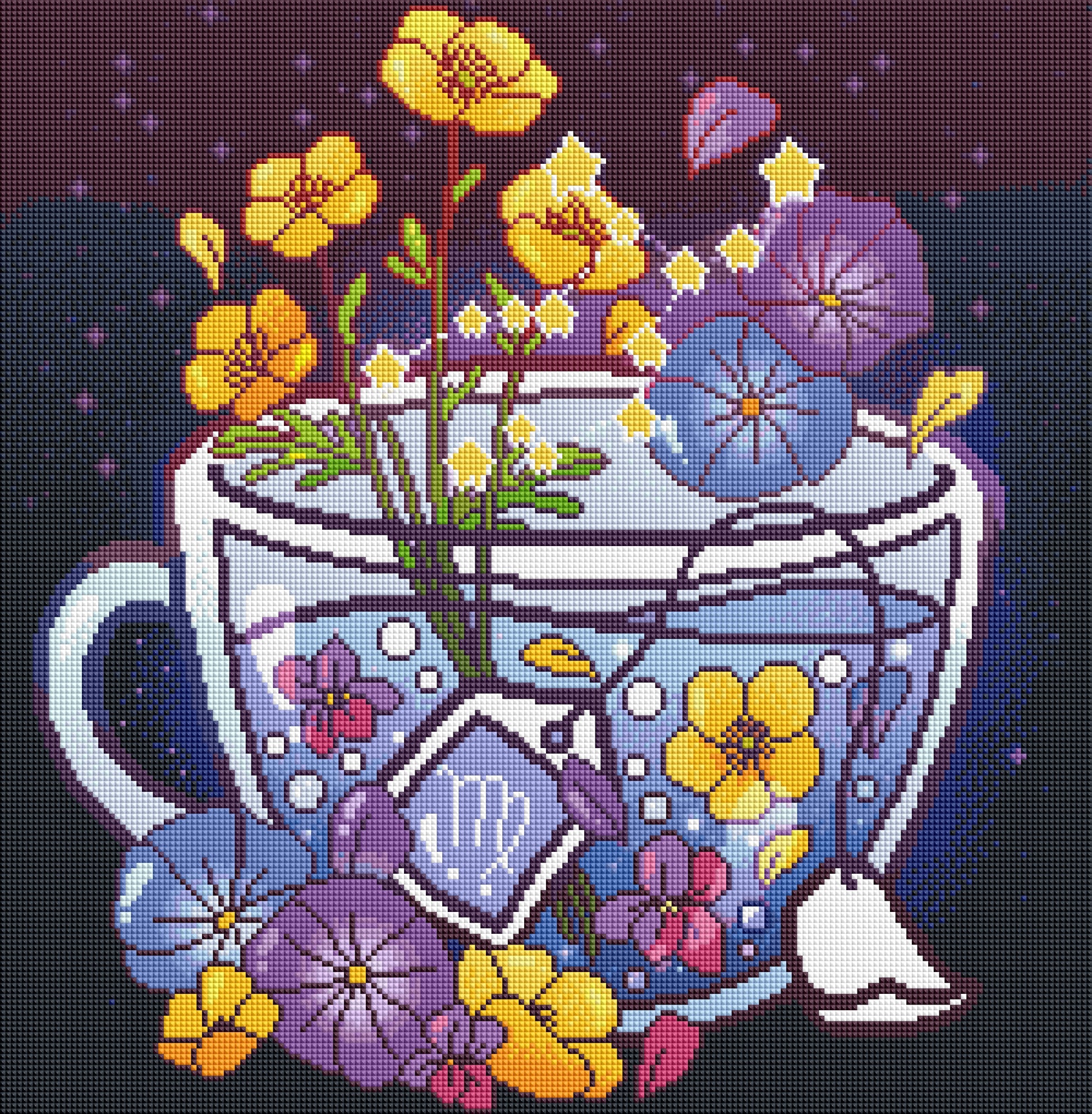 This whimsical diamond painting kit captures a Virgo teacup blooming with cheerful yellow, purple, and blue flowers, floating petals, and the zodiac symbol tag against a starry cosmic backdrop. Merging astrology and floral fantasy in shimmering pastels and golds, it's perfect for zodiac fans and relaxing crafters
